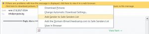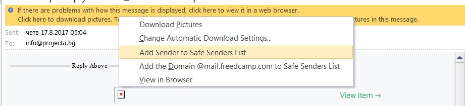 Вариант 1: Когато отворите даден имейл, ще се появи предупредително съобщение с текст “Click here to download pictures…”. Кликнете върху него и изберете “Add Sender to Safe Senders list”: