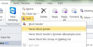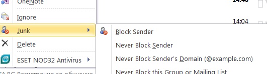 Вариант 2: Можете да добавите имейл адрес към този списък и като кликнете върху получения имейл и от менюто Junk изберете „Never block sender”: